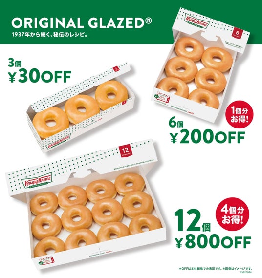 今回の価格改定により『オリジナル・グレーズド(R) ダズン ハーフ(6個)』は1個分、『オリジナル・グレーズド(R) ダズン(12個)』は4個分が実質無料となり、よりお買い求めやすくなりました。