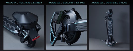河森正治氏のデザインワークスにおいてキーワードとなる“3段変形”の要素を、日常生活の中での実用性と両立させる形で機体設計に反映。都心でも郊外でも、シーンを選ばず快適にご使用頂けるよう、3通りの用途を持ったスタンドを搭載しました。