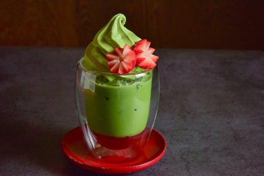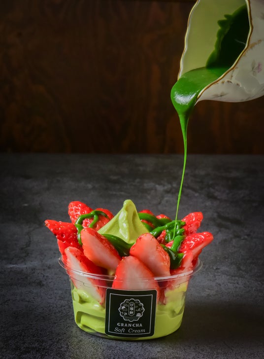 フレッシュないちごで飾られた濃厚大和抹茶ソフトクリーム