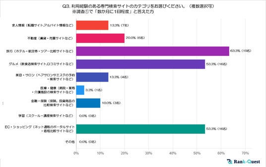 最も利用率が高かったのは「旅行(ホテル・航空券・ツアー比較サイトなど)」で63.3%となり、数か月に一度のペースでも、旅行計画時には専門検索サイトを活用する人が多いことがうかがえます。