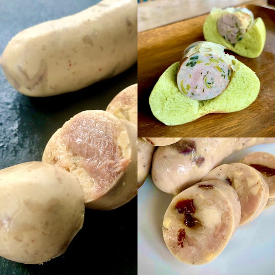左から「本鮪の葱鮪(ねぎま)ソーセージ」右上「奥多摩わさびソーセージ」右下「勝沼ぶどうと平飼い鶏のソーセージ」