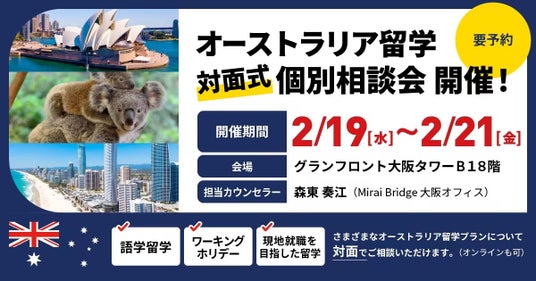 留学支援サービス「Mirai Bridge」、オーストラリア留学の無料個別相談会を大阪で開催