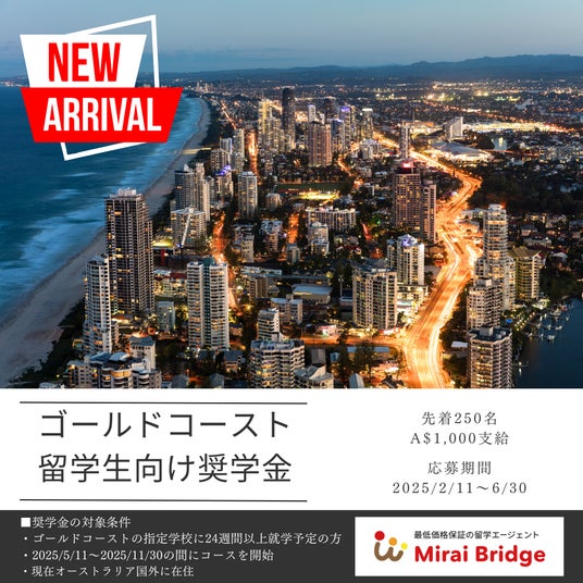 ※ゴールドコースト市より、留学生を対象とした奨学金 $1,000(約10万円) の提供が発表されました!この奨学金は、対象条件を満たした先着 250名 に支給されます。オーストラリア留学をご検討中の方は、この機会に是非お問い合わせください。