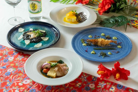 竹富島の車海老やセーイカ、石垣牛を使ったスペシャルコースメニューを提供。池原酒造「白百合」の泡盛とペアリングでお楽しみいただけます。
