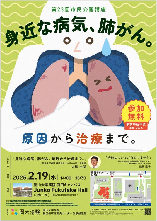 国立大学法人岡山大学(本部:岡山市北区、学長:那須保友)の岡山大学病院新医療研究開発センター治験推進部では、2025年2月19日(水)に第23回市民公開講座「身近な病気,肺がん。原因から治療まで。」を、本学鹿田キャンパスのJunko Fukutake Hall(Jホール)で開催します。