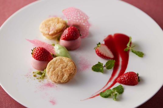 濃厚な抹茶のアイスと甘酸っぱい苺を使ったムースを盛り合わせた、春の陽気を感じさせる可愛らしいデザートプレートです。
