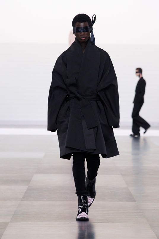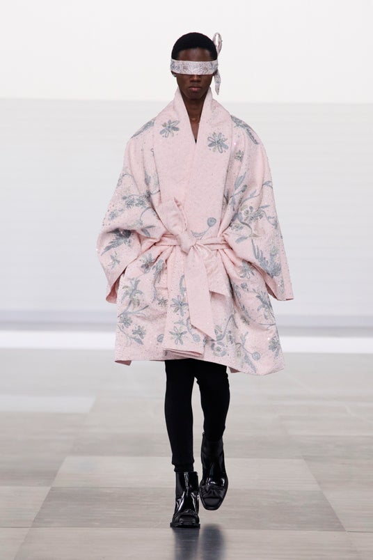 2025-2026年ウィンター メンズ コレクションで、キム・ジョーンズはメンズプレタポルテの変容、特に1954-1955年秋冬 オートクチュール コレクションの「Hライン」のインスピレーションを起点にメンズウェアの進化という概念を探求しました。その良い例が「オペラ」コートの再解釈です。このコートは、「ムーラン ルージュ」に影響を受け、フィットからフレアまで遊び心のあるボリューム感と、ストラスやパールが繊細に刺繍された「トワル ドゥ ジュイ」が特徴です。大きなボリュームのコートは、まるで一枚の布がドレープされているかのような存在感を放ちます。