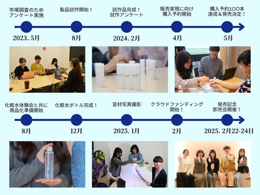 事前購入予約をわずか1か月で100本達成スキンケア市場は競争の激しい分野であり、製品化には慎重な判断が求められました。そこで、実際の市場ニーズを確かめるため、事前購入予約を実施し、予約目標100本を達成した場合に製品化へと進む方針を決定しました。結果、予約開始からわずか1ヶ月で目標を達成。この反響は、美人の湯・美肌の湯として知られる「藤塚の湯」の魅力が、多くの方々に支持されていることを証明するものでした。予約購入者の多くは、藤塚の湯の利用者や学生の挑戦を応援する方々です。地域の温かい支えを受け、プロジェクトは次の段階へと進みました。