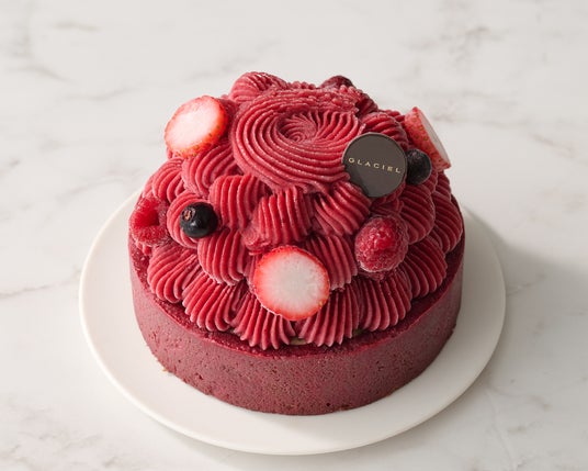 アールグレイやバニラなどベリーの味わいを引き立てる素材を合わせたアイスケーキ。苺、ラズベリー、カシスの3種のベリーにアールグレイの香りをまとわせたグラスアールグレイショコラオレ。それ を引き立てるミルキーなグラスバニーユを重ねました。ソルベトリプルベリーを華やかな絞りにしてベリーの華やかな味わいを表現しています。