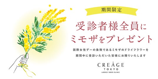 女性のための人間ドック「クレアージュ東京 レディースドッククリニック」(場所:東京都 千代田区有楽町)は、3月8日(土)の国際女性デーに向けて、対象期間中にご受診いただいた皆様に、国際女性デーの象徴であるミモザのドライフラワーをお渡しするキャンペーンを実施いたします。