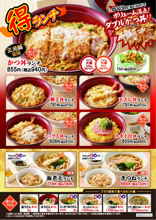※プラス価格で・税込+110円で「ちくわ天うどん」・税込+110円「三角揚げうどん」・税込+300円「だし割りカレー」がお選びいただけます。