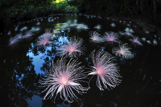 夜になると花が開き、夜明けとともに散ってしまう、幻の花・サガリバナ。人が気づかないうちに咲いて散るため、「幻の花」や「一夜花(ひとよばな)」とも呼ばれます。バニラのような甘い香りも特徴的で、辺り一面が甘い香りに包まれます。淡い桃色や白色の儚い花が水面を埋め尽くす、まるで絨毯を敷き詰めたかのような、この時期ならではの絶景を楽しむことができます。
