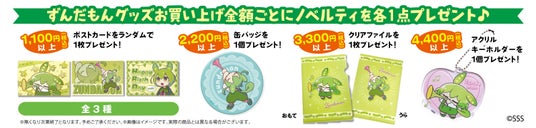 ■店舗にて『ずんだもん』関連商品をご購入いただいた金額に応じて、のんたお氏、坂本アヒル氏の描き下ろしデザインによる“オリジナルノベルティ(非売品)”各1点をプレゼント! *数量限定のため、無くなり次第終了いたします。