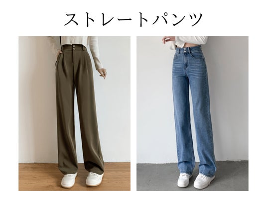 太ももから裾にかけてまっすぐなラインが下半身の気になる部分をカバーしてくれるのがストレートパンツ。