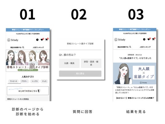 ユーザーは、スマートフォンからStladyの「骨格ストレート×顔タイプ診断」の診断ページ(https://www.stlady.jp/pages/diagnosis) にアクセスします。 その後、画面の案内に従って「顔のパーツの特徴」といった全10個の質問に回答をします。