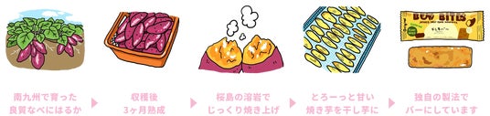 南九州の自然豊かな大地で育った良質な「紅はるか」を90日以上熟成。鹿児島県のシンボル・桜島の溶岩で長時間かけて低温で焼き芋に。この焼き芋を丁寧に‘’干し芋’’にし、独自の製法で栄養素と甘みを最大限に引き出しバーにしました。