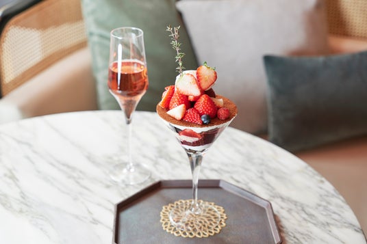 旬のイチゴを使用したティラミス風パフェ。濃厚なマスカルポーネクリームにほろ苦いコーヒーゼリー、酸味のあるミックスベリーソースがさっぱりとした味わいです。セットのカクテル「キールインペリアル」とのマリアージュをお楽しみください。