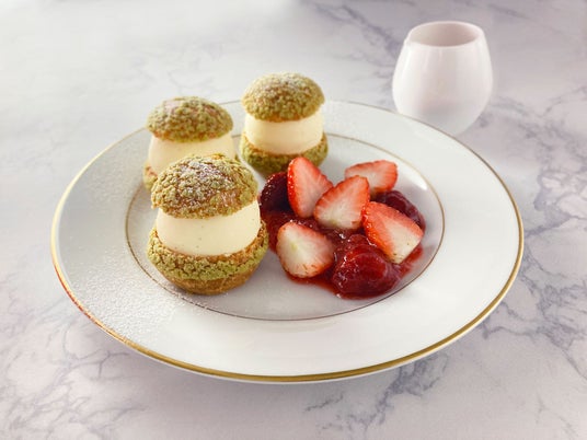 イチゴとヴァニラのケーキ「バガテル」をプロフィットロールのデセールに仕立てました。ヴァニラアイスをサンドしたクッキーシューと上品な甘みのイチゴのコンポートにフレッシュイチゴを合わせた春らしい軽やかな味わいをお楽しみください。