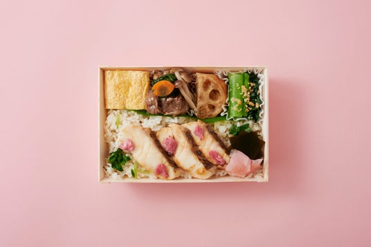 だし巻き玉子やレンコンのはさみ焼きなど、やさしい味付けの和のおかずがたっぷり詰め込まれたお弁当。それらのおかずがさわやかな鯛めしに良く合います。ふたを開けた瞬間に桜の香りがふわりと漂う、季節感満載のお弁当です。