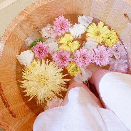 季節の花を浮かべた華やかな足湯に浸りながら、お飲み物とお茶菓子を堪能。セラピストによるフットマッサージでゆったりとお寛ぎいただけます。EXサービス限定で嵐湯オリジナル入浴剤をご用意。