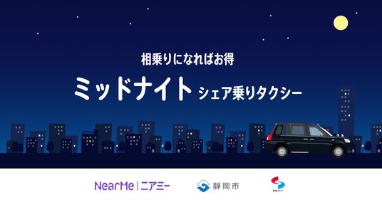 移動に関する課題解決に取り組むソーシャルデザインカンパニー、株式会社NearMe(本社:東京都中央区、代表取締役社長:高原幸一郎、以下「ニアミー」)は、電車やバスが運行していない早朝及び深夜帯における移動手段として「ミッドナイトシェア乗りタクシー」を本日、2月14日(金)から静清交通圏で開始します。なお、本サービスは、静岡市(市長:難波 喬司)が主催する新社会システム共創コンテスト「知・地域共創コンテスト」で優秀賞を獲得したビジネスプランをもとに展開するものです。