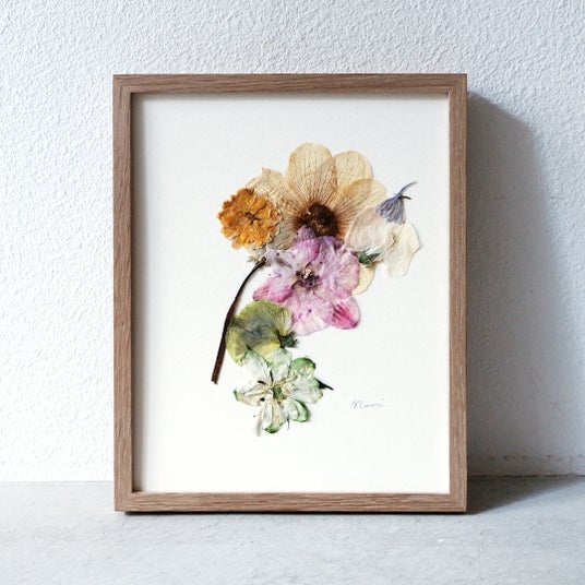 梶谷奈允子が制作した押し花を台紙に貼り、押し花のアートをつくります。額に入れ、飾れるようにしてお持ち帰りいただけます。