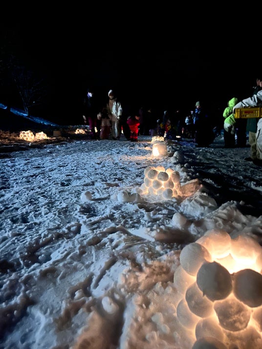 夜には、参加者が日中に作った雪玉灯籠を灯し、氷点下の冬の森に幻想的な空間が。輝く灯籠の道を歩きながら自作の雪玉灯籠をのんびり眺め、参加者は冬の夜を満喫しました。