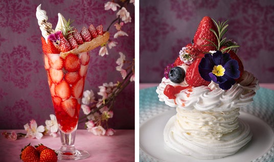 左:『いちごと桜のパフェ ~Strawberry Temptation~』 右:『いちごのパブロヴァ ~Wedding Dress~』