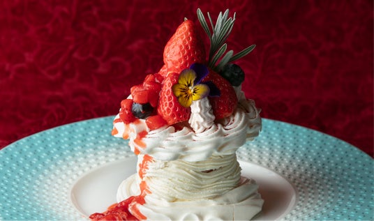 メレンゲのまるで雲を食べているかのような軽やかさと、生クリームとブリュレクリームのなめらかさ、いちごとマスカルポーネのアイスクリームの甘酸っぱくコクのある味わいをお楽しみいただけます。さらに、完熟いちごの果肉がたっぷり入った別添えソースで一層のいちご感をご堪能ください。