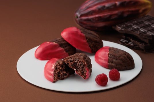 カカオの実の皮をイメージした鮮やかな赤いチョコレートコーティングには、フルーティーなラズベリーの香りを忍ばせました。(ラズベリー香料を使用)