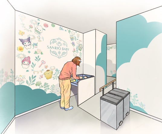 また、“大切なあなたの笑顔が咲きますように。”をコンセプトとしたベビーギフトブランド「Sanrio Baby」のデザインを取り入れました。壁にはサンリオのキャラクターたちの姿が描かれ、パステルカラーを基調としたあたたかな空間となっています。サンリオエンターテイメントはこれからも、赤ちゃんやご家族のみなさまがより快適に、安心してご利用いただける空間提供を目指します。