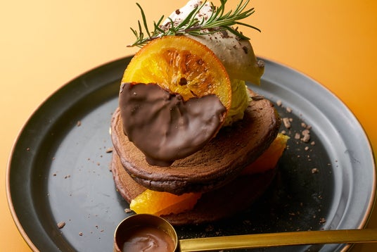 ビターに焼き上げたココアパンケーキにフレッシュなオレンジをサンド。オランジェットと濃厚チョコクリームはとろけるような口どけと、オレンジのほろ苦さが絶妙な大人のパンケーキです。