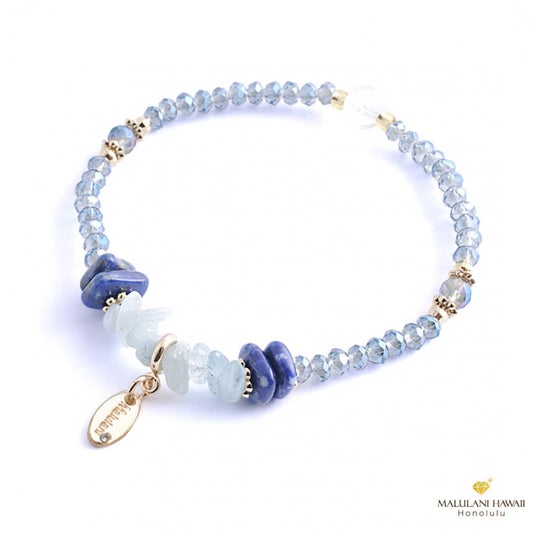 海のような浄化作用を持つアクアマリン、最強の幸運をもたらすラピスラズリに、気の流れを調和するアクアオーラを組み合わせた、厄除けと強運のブレスレット。