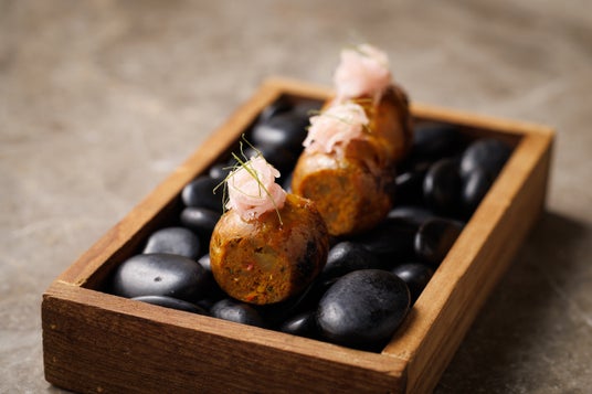 キャラメリゼした百合根を包んだ温かい餅。下にはローストココナッツを敷き詰め、ココナッツミルクで作ったソースをかけて。ほんのり甘くクリーミーなタイの伝統デザート。