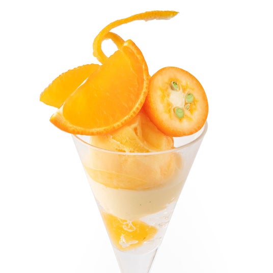 オレンジのさわやかな香りでさっぱりとした店内製造のオレンジシャーベットと、コアントローゼリー、ディプロマットクリームを重ねたパフェです。