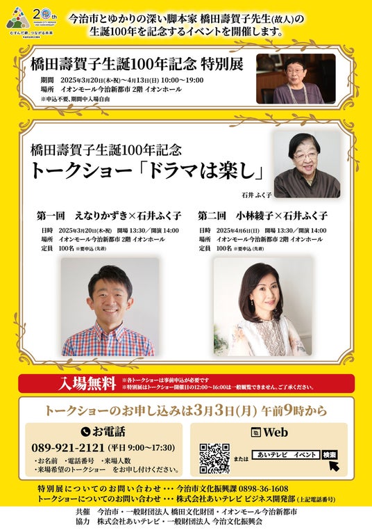 2025年の生誕100年を機に、今治市は一般財団法人橋田文化財団、イオンモール今治新都市と協力し、先生の功績を称え、多くの方にその魅力を伝えるため、以下のとおり記念事業を実施します。