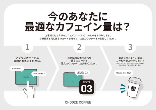 2025年2月17日(月)から、「CHOOZE COFFEE(チューズコーヒー)」日本橋店で、その日の健康状態や予定を把握し、最適なカフェイン摂取量を提案する「カフェインレコメンドサービス」を開始いたします。