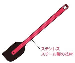 ヘラの内部の芯材は、包丁と同じ焼入れを施しています。これにより、硬さと弾性が引き出され、衝撃や曲げに強い構造になっています。バター生地など固さのある生地でもしっかりと混ぜることができます。