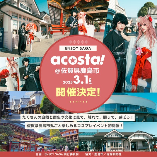日本全国でコスプレイベントを運営する株式会社ハコスタ(本社:大阪市、代表取締役:松村 良洋)は、2025年3月1日(土)10時30分より、コスプレイベント「acosta!(アコスタ)」を佐賀県鹿島市で初開催します。同イベントは、鹿島市の協力のもと街全体を会場として開催し、歴史ある街並みや豊かな自然を活かしたコスプレの撮影会や地域との交流を通じて、鹿島市の魅力を世界に発信していきます。