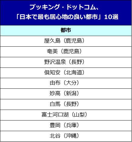 ブッキング・ドットコム、「日本で最も居心地の良い都市」10選を発表!「屋久島」「奄美」自然豊かな場所、「野沢温泉」「由布」温泉地が人気