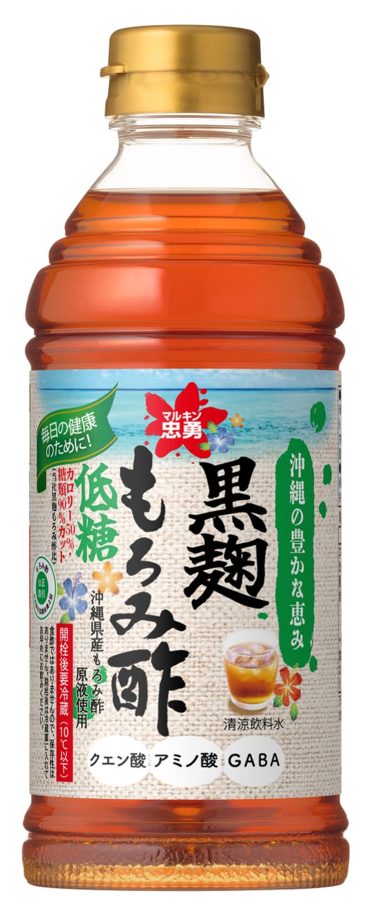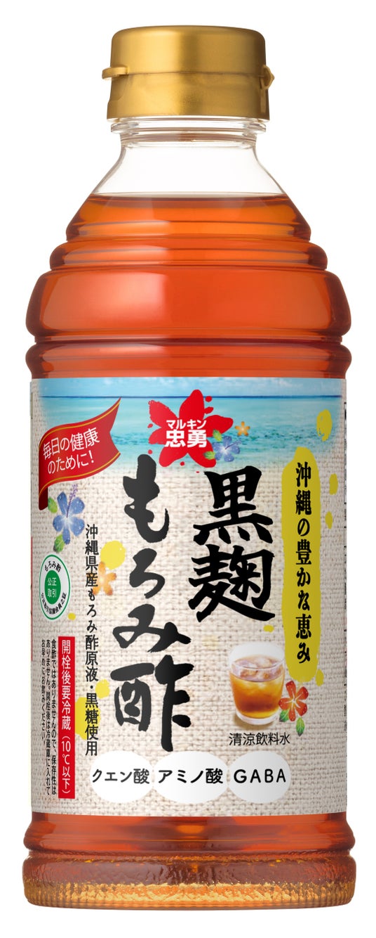 マルキン忠勇の「黒麹もろみ酢」は、沖縄の泡盛を造る際に、蒸留の過程で出来るもろみ粕「かしじぇー」を搾って造られる、まろやかな酸味が心地よい発酵クエン酸・アミノ酸飲料です。健康サポート飲料として愛され続け、おかげさまで発売30周年を迎えこの度、「琉球もろみ酢」を沖縄の豊かな恵み「黒麹もろみ酢」プレーン・低糖として、名称およびデザインのリニューアルを行いました。「黒麹もろみ酢」はセルフケアニーズが年々高まる昨今、クエン酸、アミノ酸、GABAなどの身体にうれしい成分を手軽に取り入れられる飲料として安定した人気を保っております。
