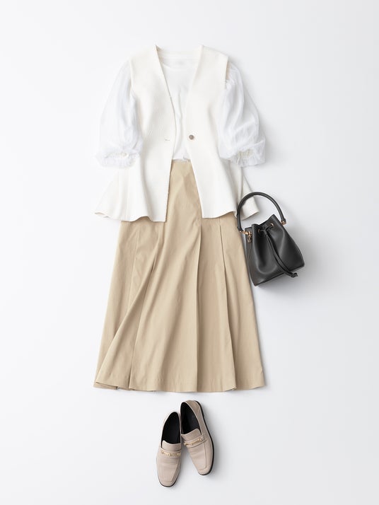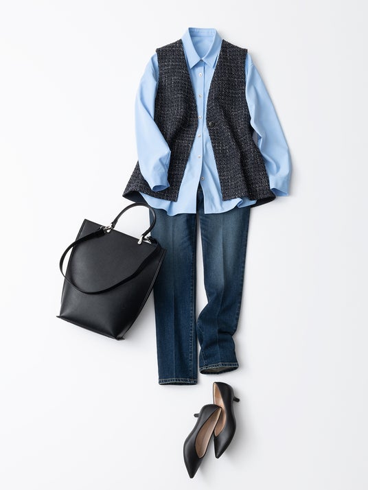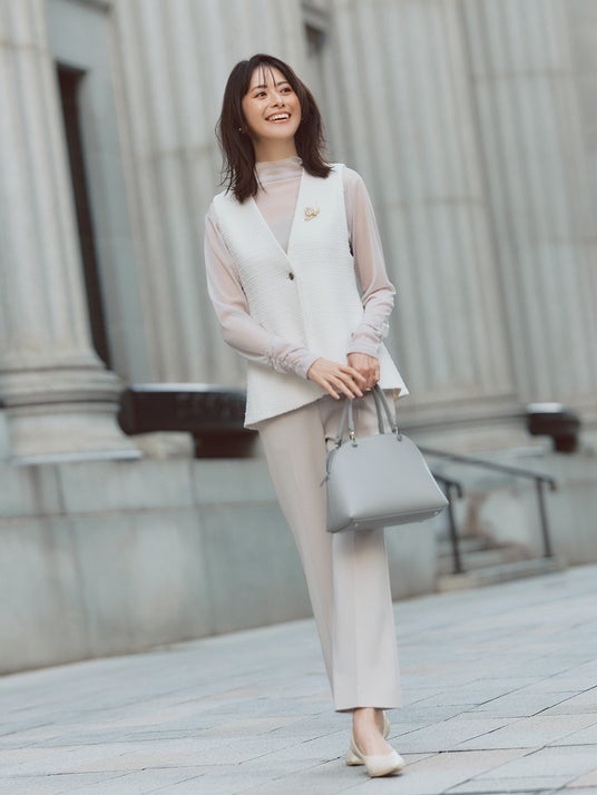 光を反射する糸を使用し、生地表面が煌めくことで品のよさを演出する「ツイードペプラムジレ」は、後ろの裾がふわっと広がるペプラム仕様にすることで、女性らしく華やかなデザインに仕上げました。セレモニースタイルには、センタープレス入りのテーパードパンツやきれいめのブラウスと合わせ凛とした印象に。デイリーな着回しには、シャツと合わせてクールでコンサバなスタイリングが完成します。アームホールが広くとられているため、ボリューム感のあるトップスとも相性抜群です。