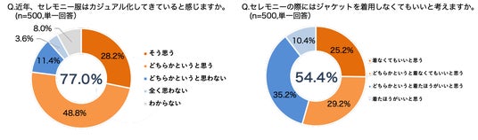 春に訪れる卒入園・卒入学式で着用する「セレモニー服」について、約8割(77.0%)がカジュアル化してきていると感じていると回答。さらに、セレモニー服の定番でもあるジャケットを着用しなくてもいいと思う人が全体の半数を超える(54.4%)結果となりました。コロナ禍以降、式典の形式や生活スタイルなども変化している流れを受けて、セレモニー服もカジュアル化してきていることがうかがえます。