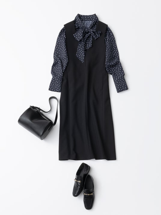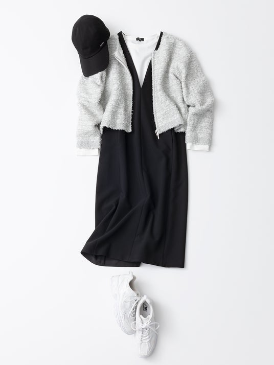 スタイリッシュにセレモニースタイルを着こなしたい方には「ダブルクロスジャンパードレス」がおすすめ。首元をシャープに見せる深めのVネックとIラインのシルエットが織り成すすっきりとしたデザインは、重ねるアイテムを選ばずに着られます。シアーなインナーを合わせると、今どきなセレモニースタイルに仕上がります。Tシャツやカットソーにスニーカーを合わせてカジュアルにも着られる、汎用性の高さが魅力のアイテムです。