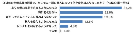 物価高騰などの影響を受けた、セレモニー服を購入する際の変化について聞くと、「より安価な商品を求めるようになった(34.2%)」「特に変化はない(23.8%)」「日常使い・着回しできるアイテムを選ぶようになった(23.6%)」が上位となる結果に。