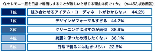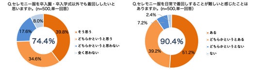 また、7割以上がセレモニー服を日常でも着回したいと回答する一方で、着回しが難しいと感じている人は9割という結果に。実際に半数以上のママが、セレモニー服は式典時にしか着用せずにクローゼットのなかで眠ってしまっているという実態も明らかとなりました。