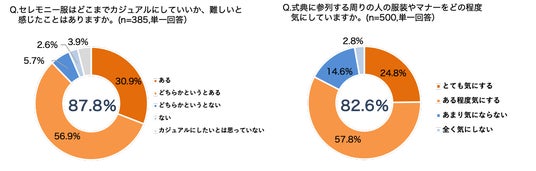 カジュアル化が進んでいるという声が多かった一方、どこまでカジュアルにしていいか難しいと感じている人は約9割(87.8%)にものぼることが明らかに。また、式典に参列する周りの人の服装やマナーをどの程度気にしているかという質問に対して、気にすると答えたママは8割以上(82.6%)となり、多くの人がカジュアル化の線引きに頭を悩ませていることが浮き彫りとなりました。記念すべきセレモニーの機会にマナー違反になりたくない、失敗したくないという意識があることもうかがえます。