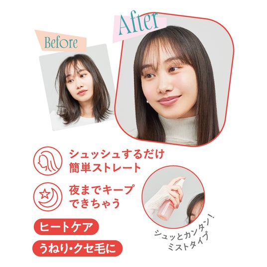長年髪の悩みと向き合ってきたダイアンだからこそ実現したオリジナルの技術で、憧れのまっすぐ髪へ。タオルドライ後にスプレーし、ドライヤーで髪を整えながら乾かすだけでストレートスタイルが夜まで続くヘアミスト。(乾いた髪にもお使いいただけます)ヒートケア成分*1 も配合し、1本で「ストレートキープ」「髪のうねり&ダメージ補修」が叶うスペシャルなヘアミストです。