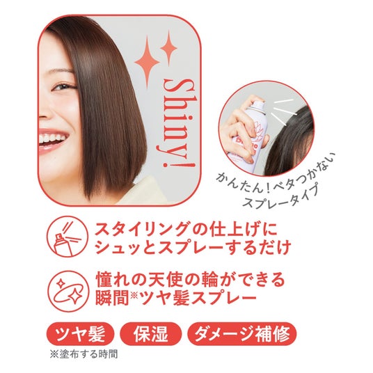 スタイリングの仕上げとして、髪全体にスプレーをするだけで、ケラチン*1 などのダメージ補修成分と植物由来のオイルがキラツヤ髪を作ります。特に毛先にかけて潤い&サラサラをキープ。