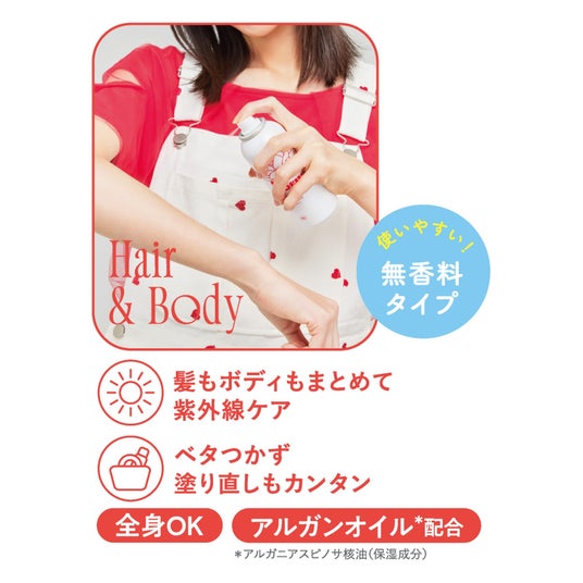 簡単&便利!1本で髪もボディもUVケアできるスプレー。SPF50+ / PA++++でしっかり紫外線対策ができるだけでなく、アルガンオイル*1 やホホバオイル*2 配合で紫外線による乾燥から潤いを守り、キラツヤなヘア&ボディに!